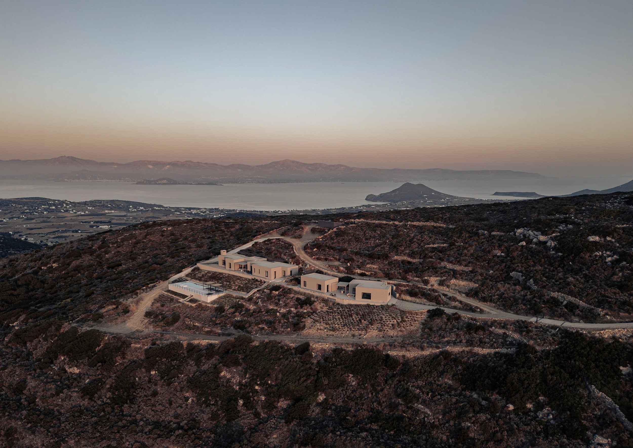 A serene sanctuary blending minimalist design with breathtaking Aegean views. The main house features a well-appointed kitchen, open-plan living and dining areas, and three luxurious bedrooms with en-suite bathrooms. Expansive windows frame the landscape, creating a seamless indoor-outdoor experience.